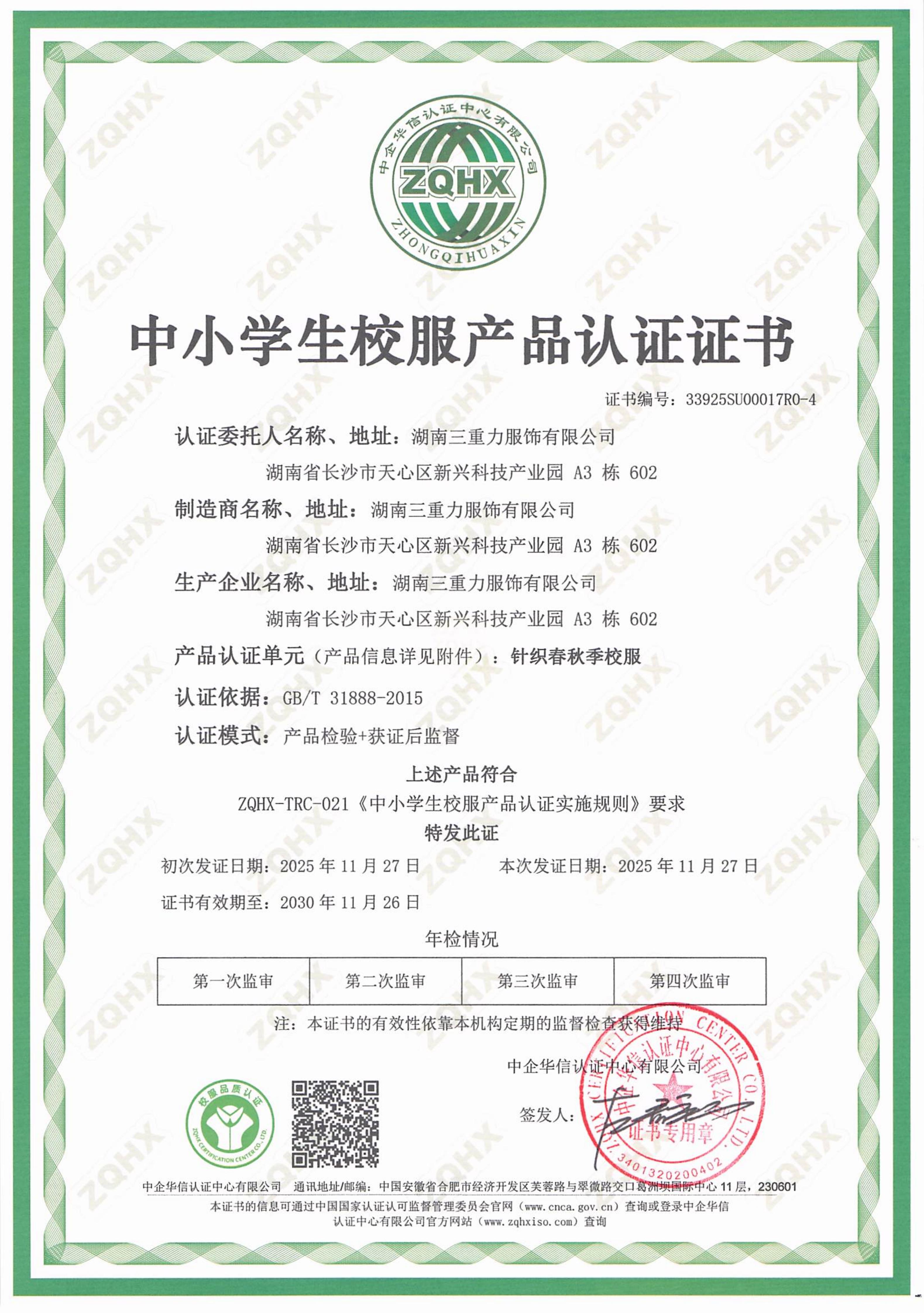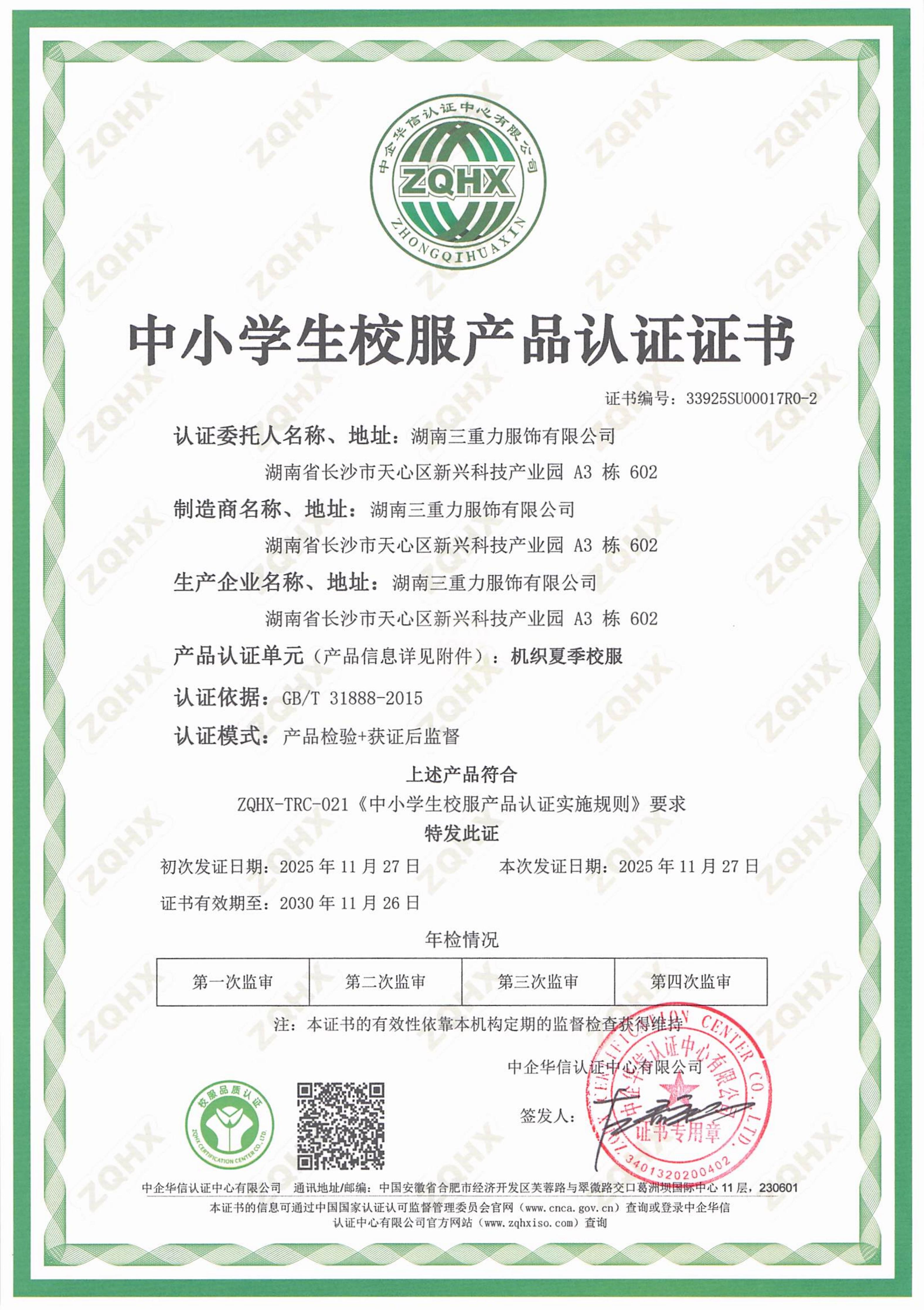 五种中小学生校服产品认证